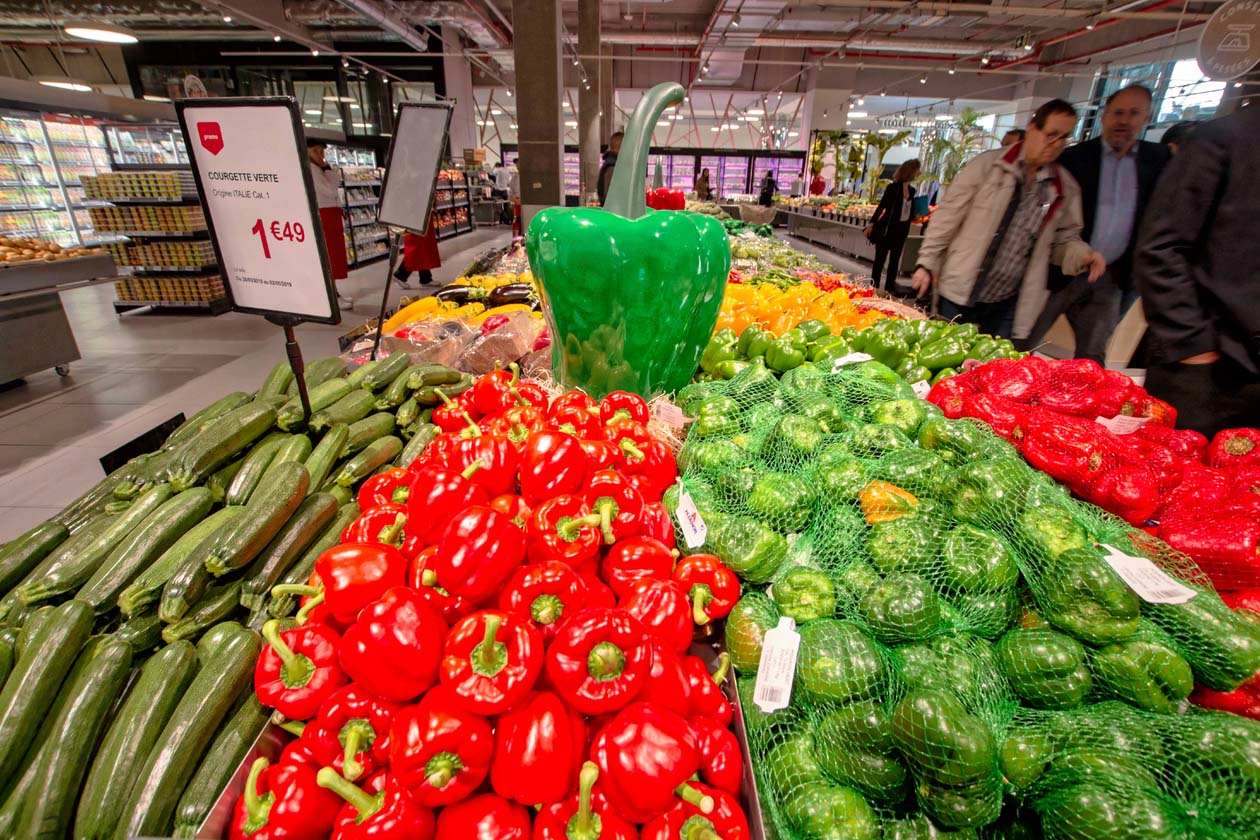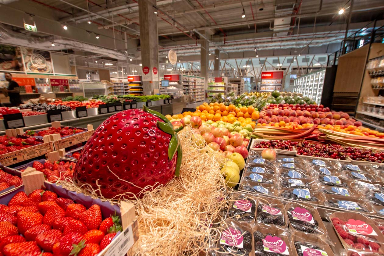 Відділ з овочами та фруктами облаштований як традиційний овочевий ринок. Покупець може вздовж довгих прилавок обрати все собі необхідне.