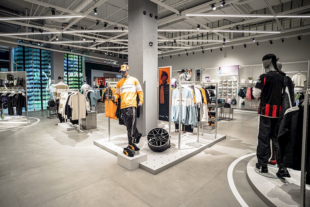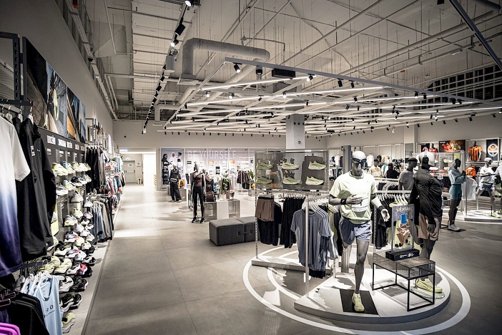 Асортимент магазину побудований за принципом performance - напрямку, який охоплює товари для бігу, тренінгу та футболу, та окрему частину займає lifestyle-сегмент - колекції для повсякденного життя, а також спеціальні лінійки для шанувальників Формули-1, в колаборації з найвидатнішими командами.