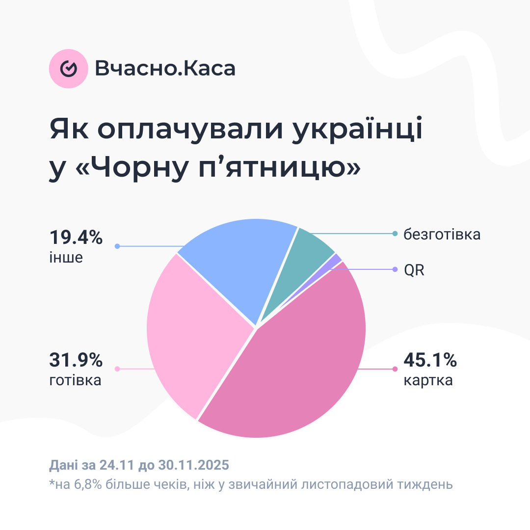 Основними способами оплати на Чорну п’ятницю залишаються картки — 45,1% усіх транзакцій, та готівка — 31,9%.