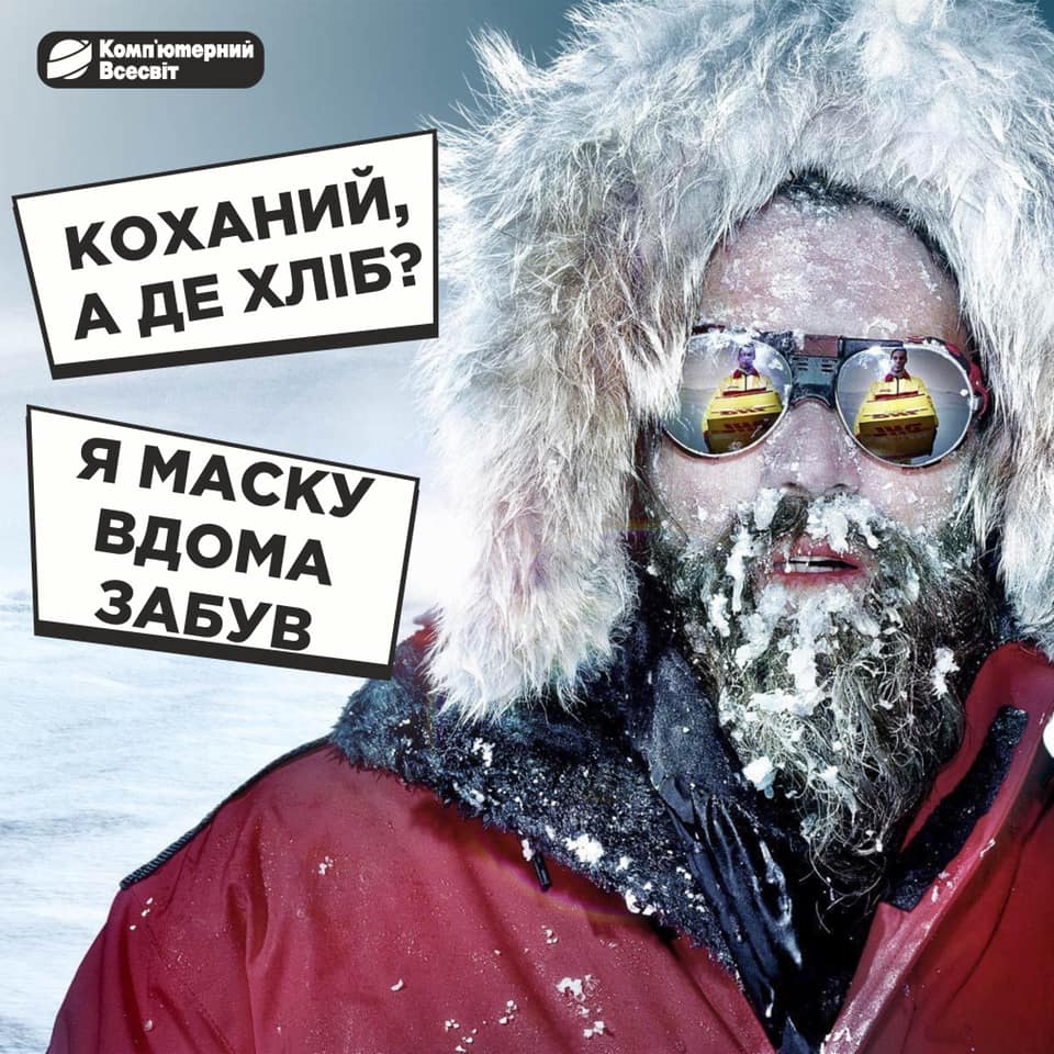 Ще один рітейлер електроніки – Комп’ютерний Всесвіт – звернув увагу на великі морози в останній місяць зими, та й передостанній, якщо вже бути точними. “Пам’ятай про маску”, – нагадали креативники мережі.