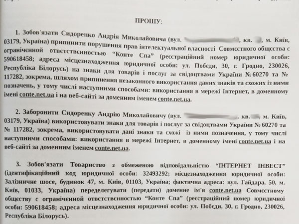 - У позові компанія вимагає припинити порушувати свої права на ТМ і переделегувати домен Conte.net.ua собі. Юристи компанії відзначають, що такий спосіб захисту прав в українському законодавстві не визначається, однак і не забороняється.