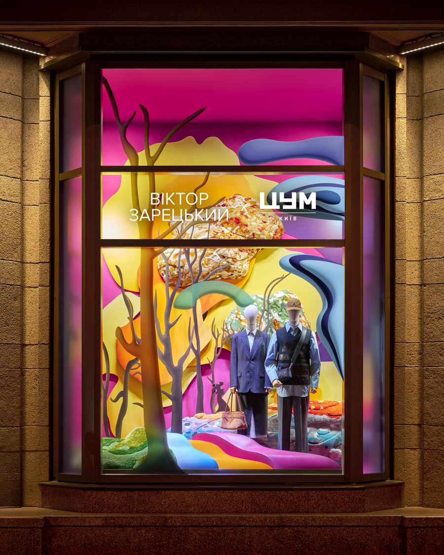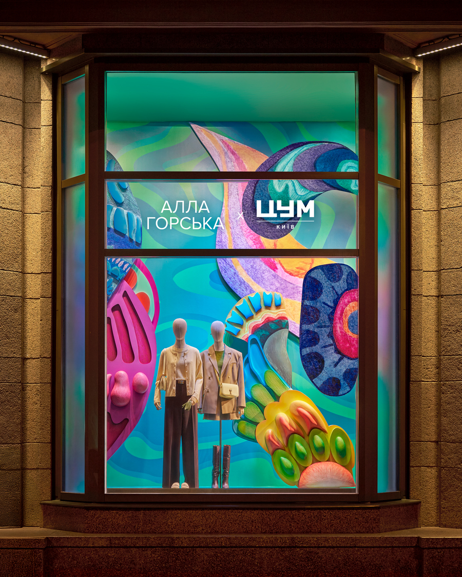Команда ЦУМ працювала з різними техніками — об’ємними формами, імітацією плитки, візуальними «розсипами» мозаїки. Для двох вітрин (2 і 6) були створені килимові композиції, натхненні палітрою оригінальних картин Зарецького. Це новий формат для арт-оформлення вітрин, який дозволив надати експозиції тактильності та глибини.