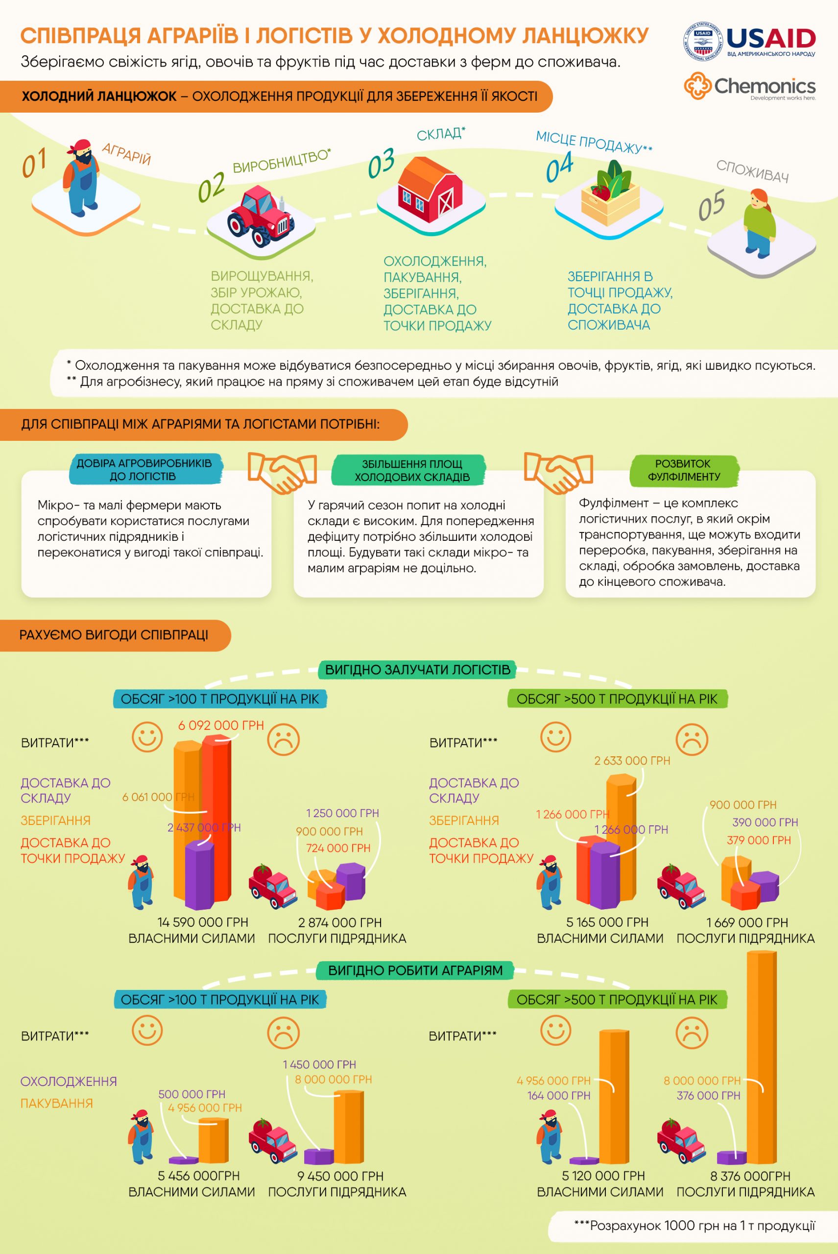 Якщо взяти короткий «холодний ланцюжок» загалом – самостійну доставку з поля до складу, охолодження, пакування та зберігання – то все це власними силами коштуватиме мікровиробнику понад 20 000 грн за тонну продукції (понад 2 мл урахуванням усіх 100 тонн урожаю), тоді як із використанням сервісних послуг –12 тис. грн на тонну продукції або 1,2 млн. грн. на рік. Різниця очевидна. Вигода для малого виробника також дуже суттєва.