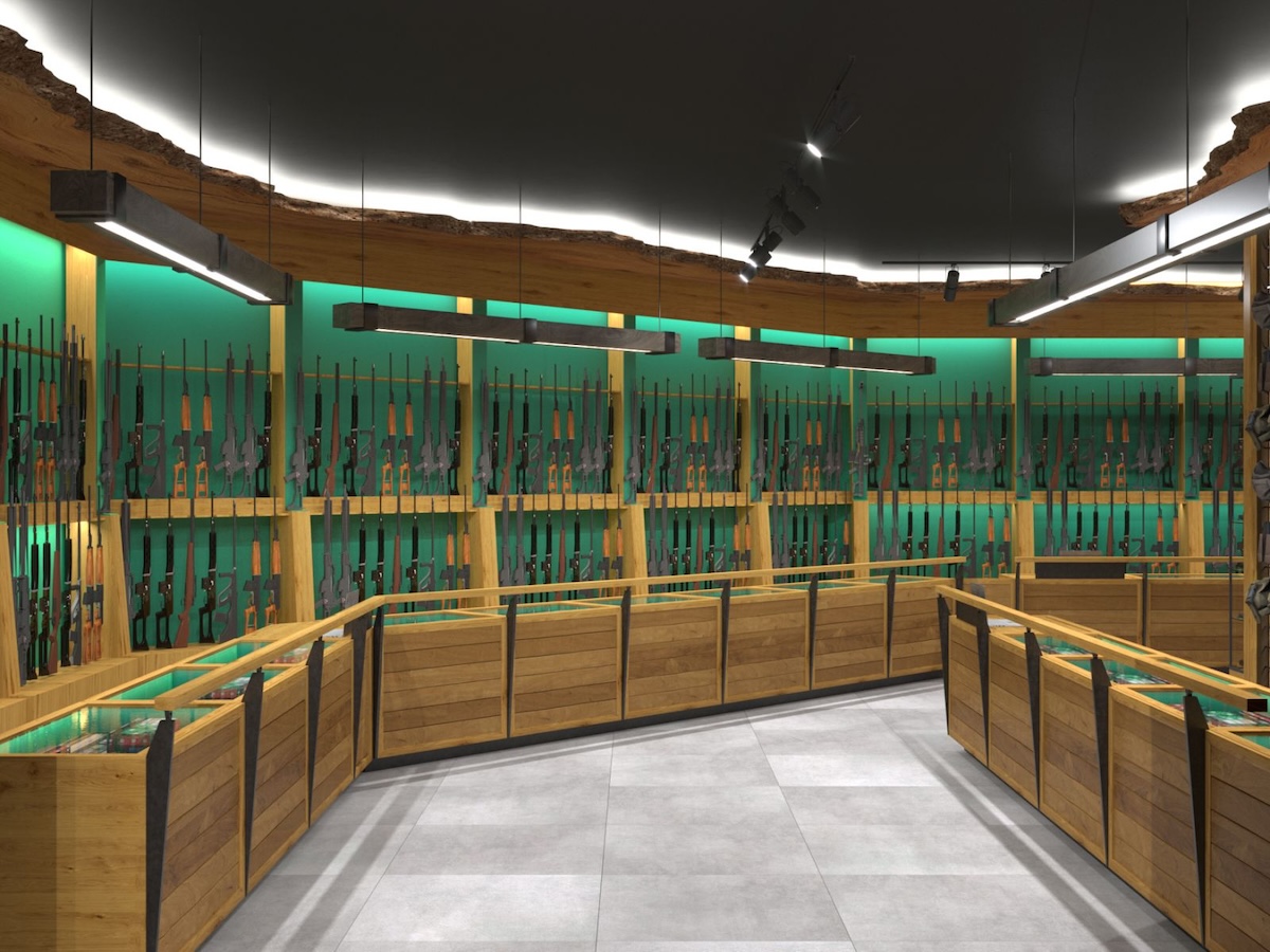 У нас був цікавий кейс з освітленням у проєктуванні одного з магазинів Ібіс. Зброя за вимогами законодавства та безпеки має бути в повністю закритому приміщенні, тому ми використали підсвітку прихованого монтажу, створивши ефект денного світла, що ніби крізь щілини пробивається з вулиці. Також ми розробили різні типи точкового освітлення з урахуванням тої чи іншої групи товарів, аби вони виглядали естетично, клієнт міг добре розглянути всі деталі, але водночас не було заяскраво.