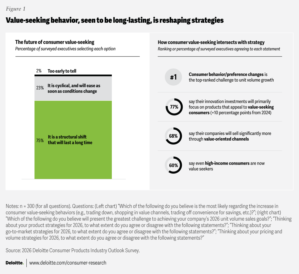 Згідно з опитуванням ConsumerSignals, проведеним компанією Deloitte, майже половина опитаних споживачів у всьому світі (47%), включаючи 35% домогосподарств з високим рівнем доходу, зараз вважаються «шукачами цінності». Тобто людьми, які регулярно жертвують зручністю, роблять вибір на користь розумного витрачання коштів (наприклад, купуючи дешевший, але якісний продукт), та купують на основі вигідних акційних пропозицій.
