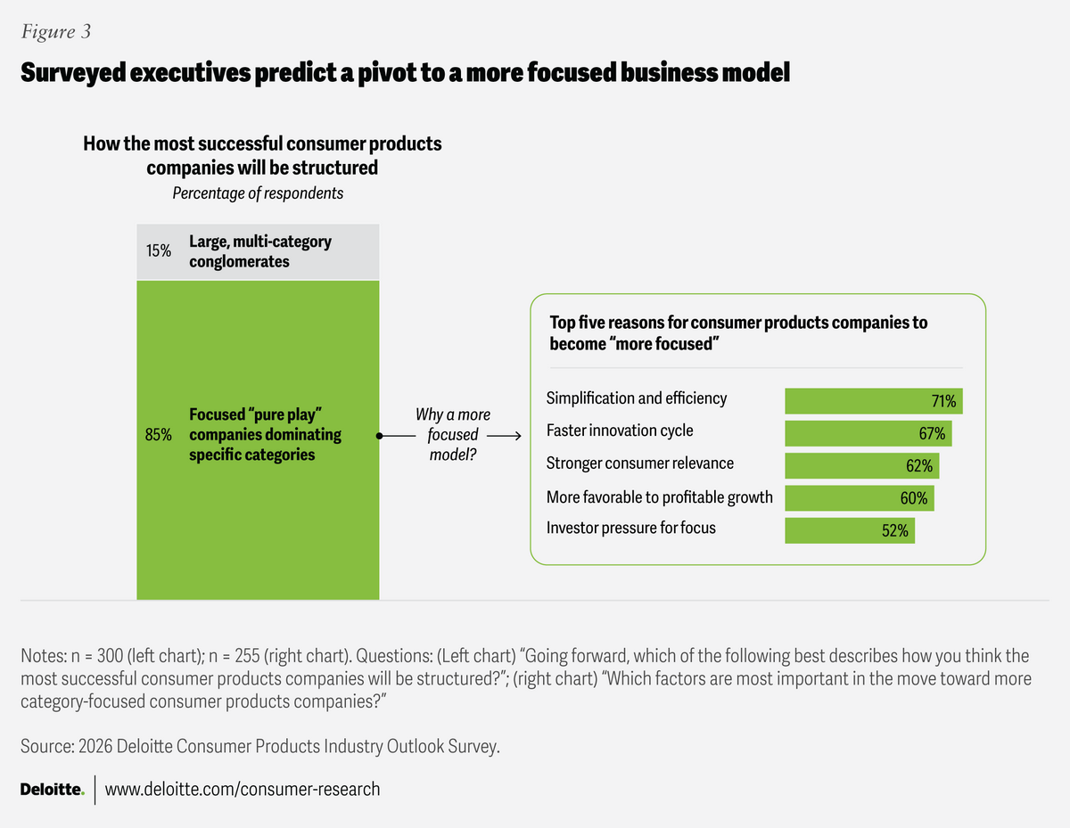 Бренди прагнуть спрощення та ефективності, швидших інноваційних циклів та більшої релевантності для споживачів, що забезпечується більш спеціалізованою моделлю. Це стратегія, спрямована на акумуляцію домінуючих, спеціалізованих компаній, які пропонують неперевершену глибину в одній категорії продуктів завдяки величезному вибору, низьким цінам та великому обсягу.