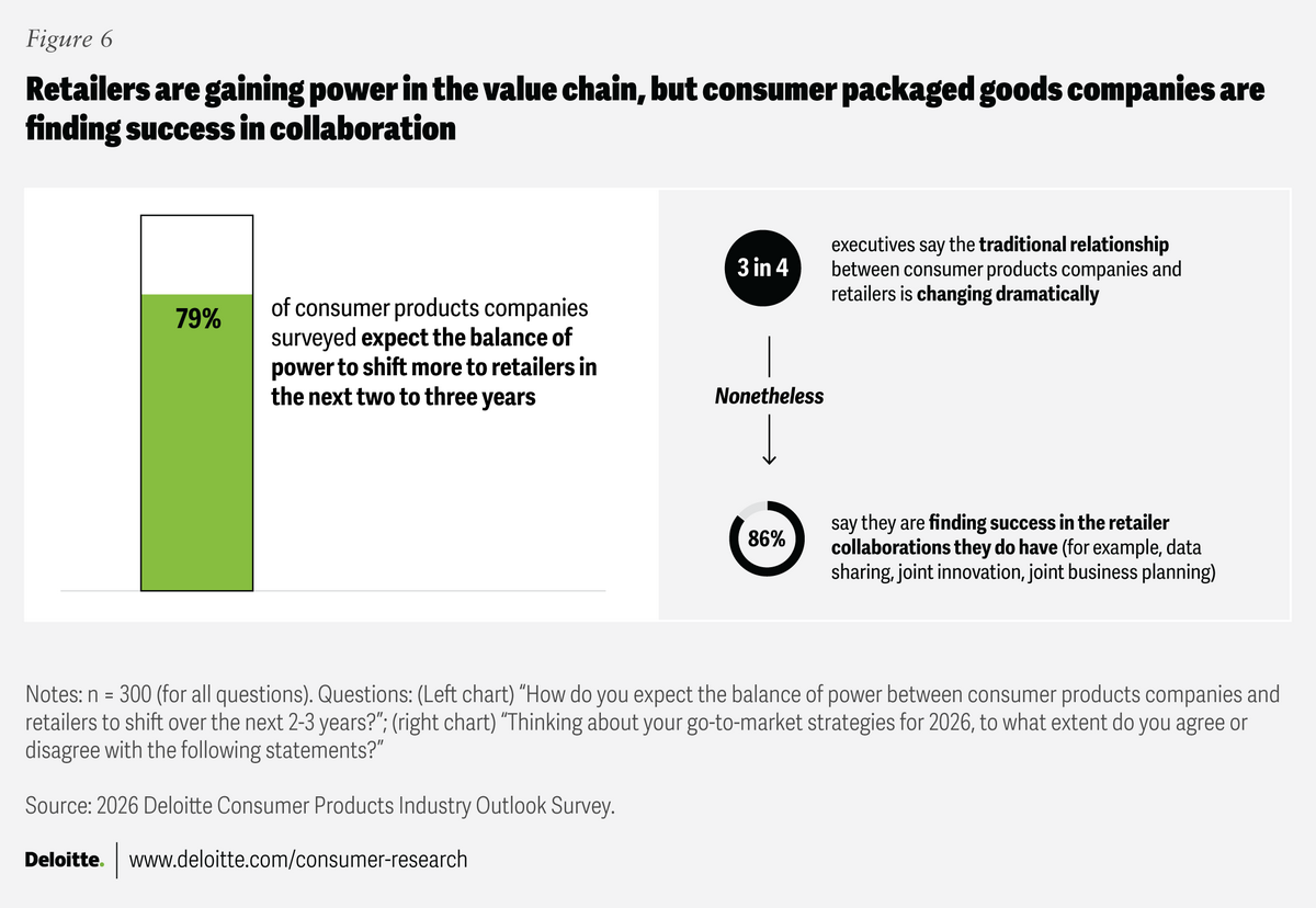 Традиційні ролі ритейлу та виробників споживчих товарів змінюються. Так, 79% опитаних керівників вважають, що баланс сил зміщується на користь роздрібної торгівлі. Великі ритейлери зміцнюють свої позиції, створюють власні бренди та ефективніше використовують дані.