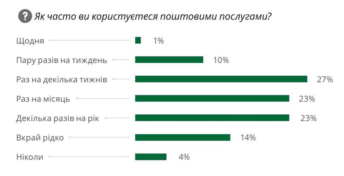 Частіші покупки онлайн спонукають регулярно користуватися доставкою та поштоматами. Загалом 96% респондентів хоча б інколи користуються поштовими послугами. Водночас інтенсивність користування залишається помірною: понад 49% опитаних звертаються до поштових сервісів не частіше ніж раз на місяць або декілька разів на рік.