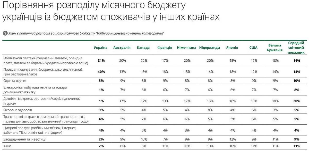 У межах дослідження Deloitte Ukraine було проведено порівняння структури витрат українців із бюджетами споживачів в інших країнах. Найбільша частка витрат українців припадає на товари та послуги першої необхідності – 84% місячного бюджету. Це обов’язкові платежі (комунальні, орендна плата, платежі за боргами/кредитами тощо), продукти харчування, охорона здоров’я та транспорт. Середній показник у європейських країнах – менш ніж половина загальних витрат.