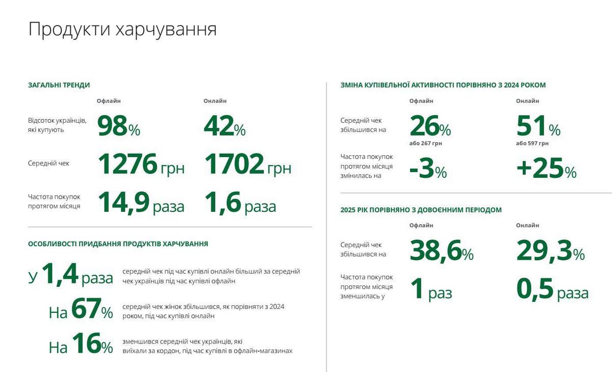 Базові покупки українці переважно здійснюють у фізичних магазинах. Зокрема, 76% споживачів купують офлайн продукти харчування (72% у 2024 році), 63% – лікарські засоби (59% у 2024 році), а 66% – товари домашнього вжитку та побутову хімію (64% у 2024 році). За словами СЕО ТОВ «АТБ-маркет» Наталі Шаповалової, у 2025 році ключовим чинником поведінки покупців стала чутливість до ціни. Українці дедалі частіше обирають формати магазинів-дискаунтерів, планують покупки й активніше реагують на акції та товари private label.