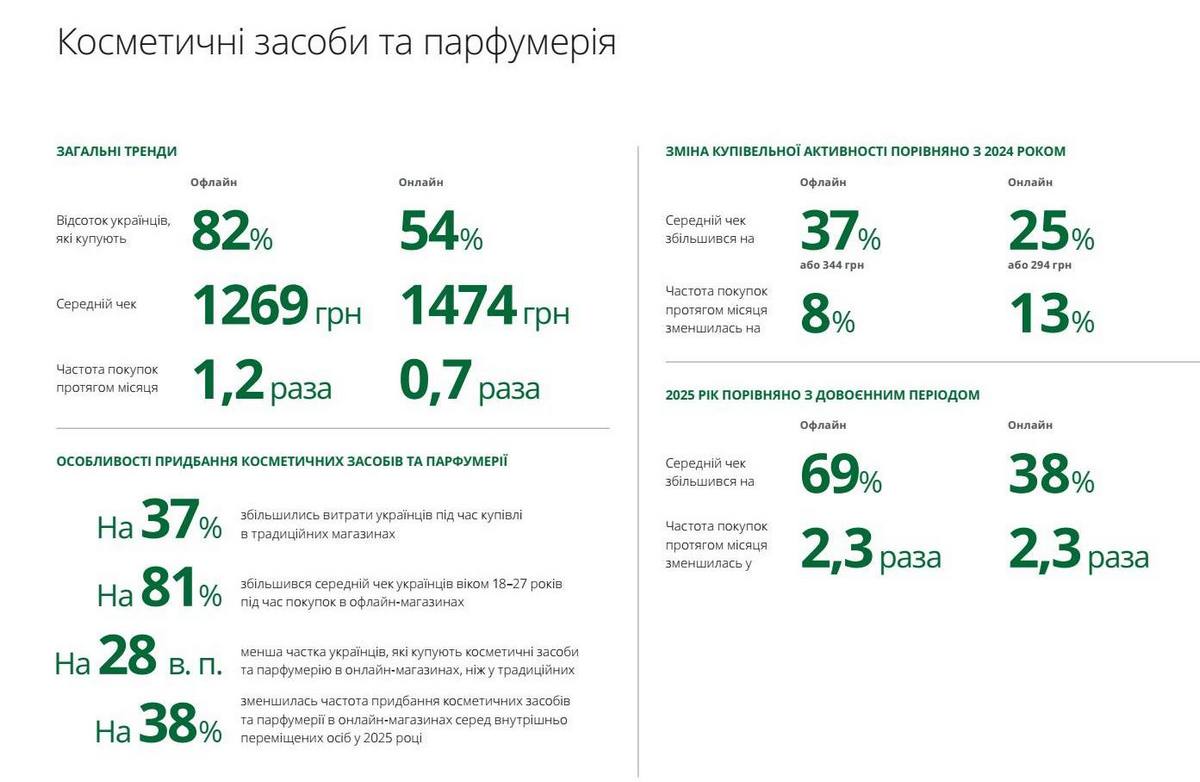 Інша картина спостерігається в сегменті косметики та парфумерії. Тут середній чек онлайн теж більше, але його динаміка приросту онлайн (+25%) програє аналогічному показнику у фізичних торгівельних точках (+37%).