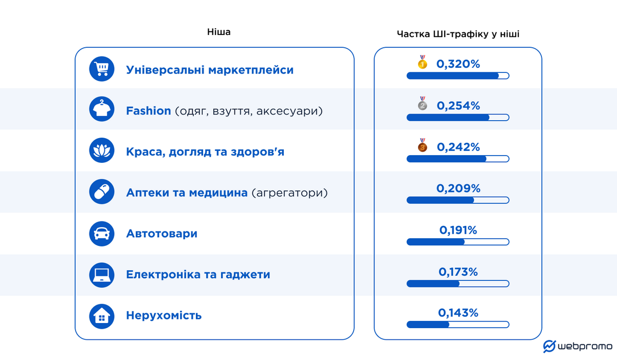 Найвищу концентрацію ШІ-трафіку отримують ніші універсальних маркетплейсів, fashion та drogerie. Користувачі у чат-ботах здебільшого порівнюють товари та шукають продукти з потрібними характеристиками. Але для самої покупки все одно повертаються до традиційних каналів — прямого переходу на сайт або класичного пошуку.
