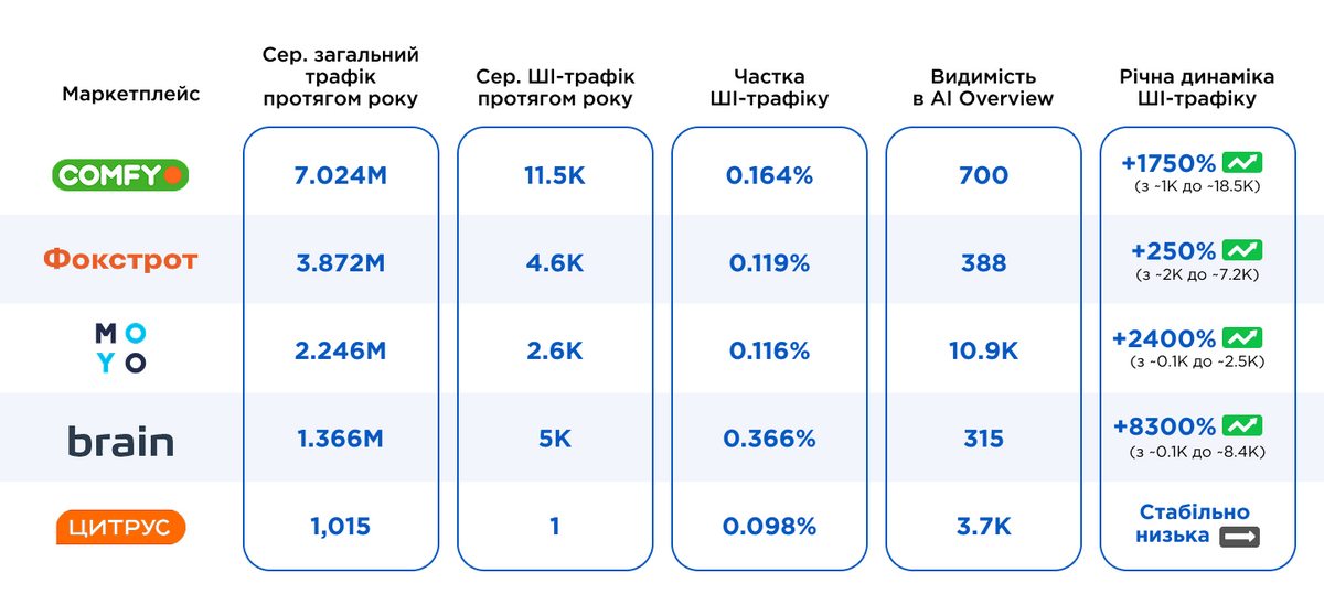 Rozetka впевнено випереджає інші маркетплейси за розміром ШІ-трафіка. При цьому ChatGPT забезпечує майже 93% усіх переходів із ШІ. Починаючи з квітня 2025 року майданчик почав стрімко зростати, збільшуючи відрив від Prom.ua.