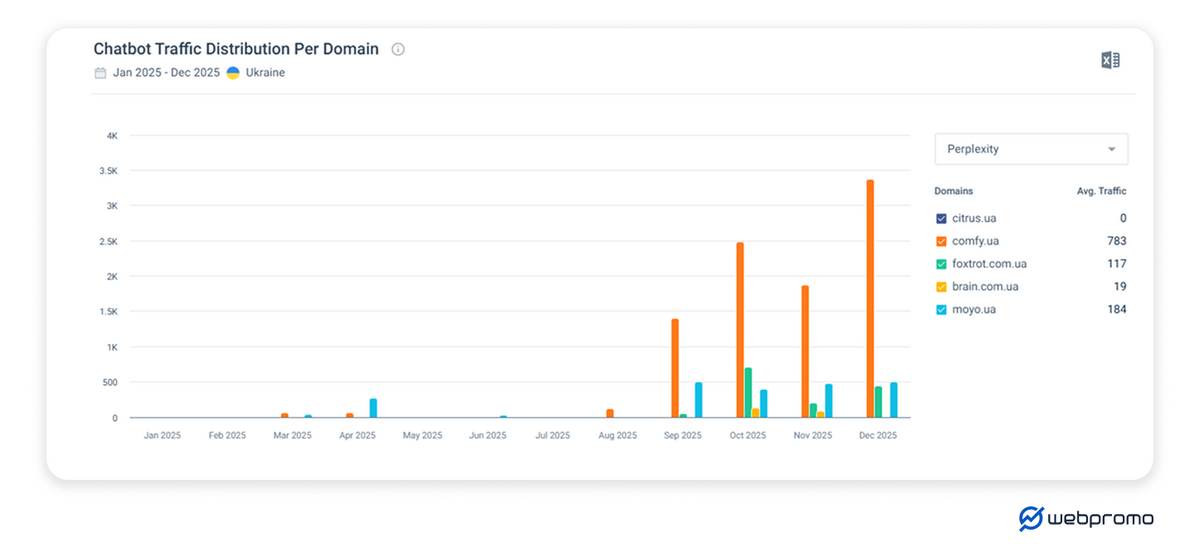 Perplexity забезпечує трафік майже для всіх представлених гравців, хоча й у меншому обсязі у порівнянні з ChatGPT. Лідерство утримує comfy.ua.