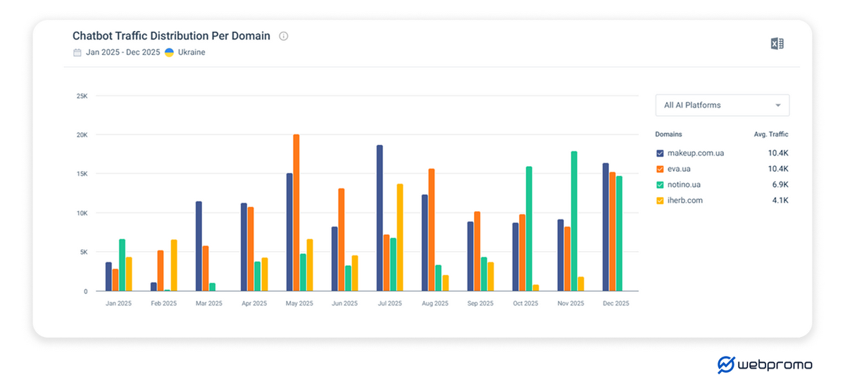 Makeup утримує стабільне лідерство протягом року з піками у липні та грудні. Водночас у травні спостерігався рекордний приріст трафіку для Eva.ua. Це може бути пов’язано з акціями до Дня матері або підготовкою до літнього сезону. Makeup.com.ua та Eva.ua мають ідентичний середній трафік — 10 400 відвідувань, що свідчить про гостру боротьбу за онлайн-аудиторію. Для цих майданчиків ШІ-трафік зріс у 3-4 рази протягом року.