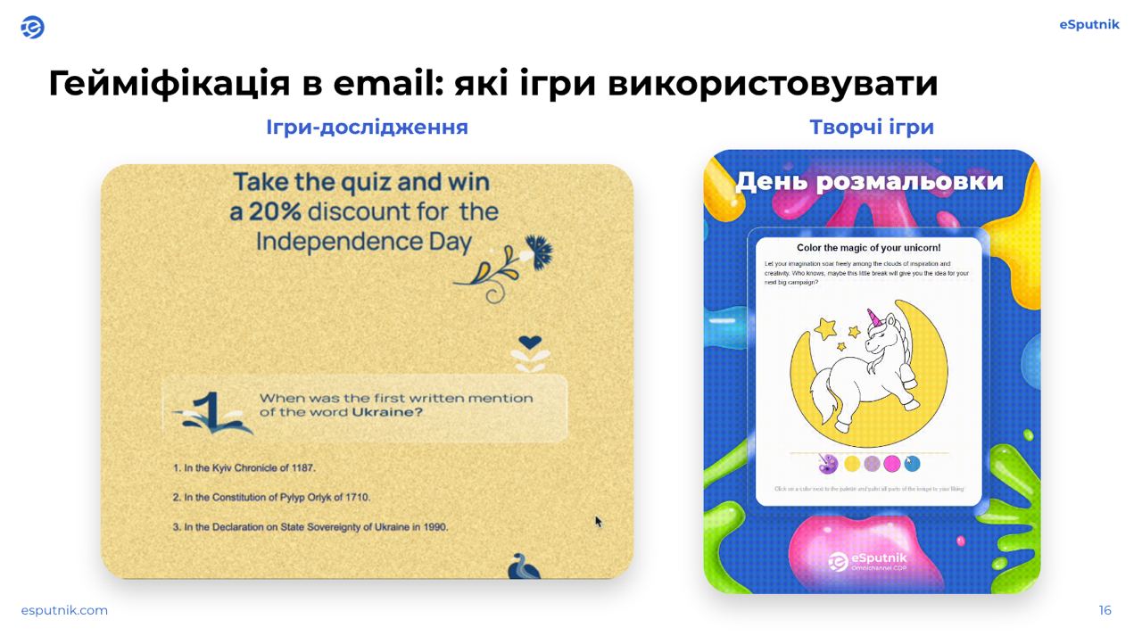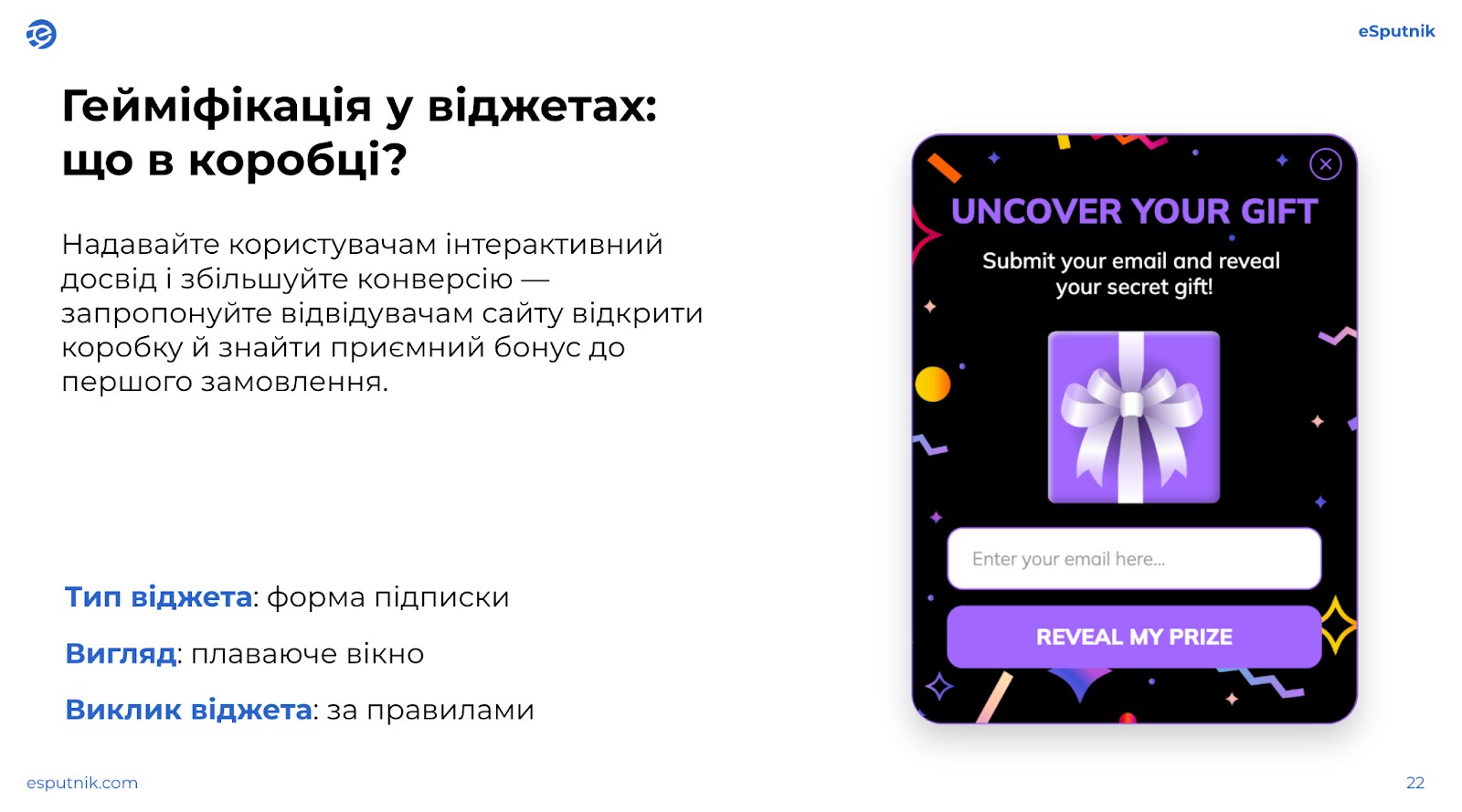 Цей інструмент можна ефективно використовувати у різноманітних каналах. Розглянемо приклади гейміфікації в e-mail-розсилках, віджетах та Telegram-боті.