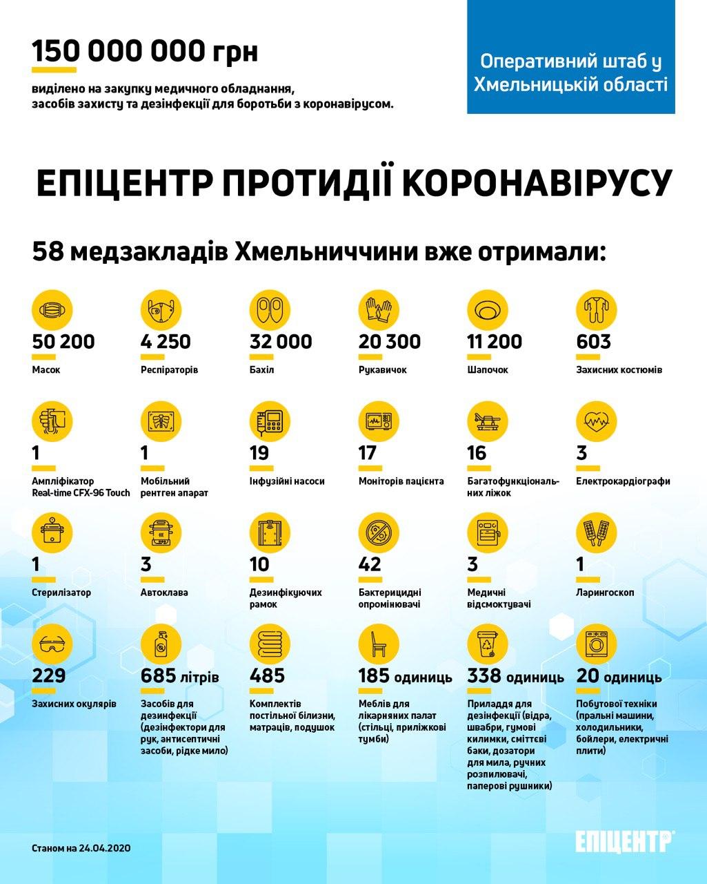 Оперативний штаб по боротьбі з коронавірусом при Хмельницькій ОДА, створений за ініціативи президента вже надав допомогу 58 медичним закладам та двом соціально-інституційним закладам догляду за вразливими категоріями населення.