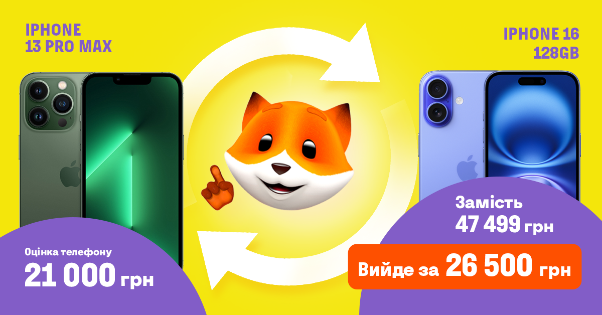 Також, якщо ви хочете оновити iPhone до останньої новенької моделі, то старенький iPhone 13 Pro Max можна обміняти на новий iPhone 16 128GB з доплатою 26 500 грн, яку можна оформити через кредит чи оплату частинами.