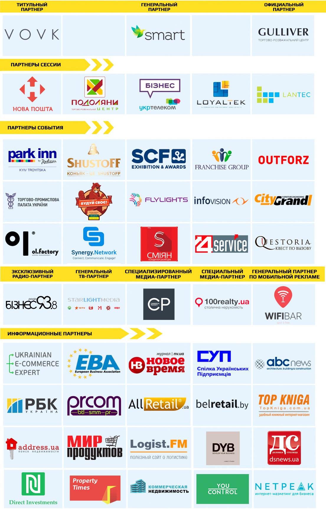 Партнери події: Park Inn by Radisson Kyiv Troyitska, Shustoff, SCF, Franchise Group, Outforz, Торгово-промислова палата України, Ощадбанк, Flylights, InfovisionCityGrand, Ol.factory, Synergy Network, СМІЯН, 4service, Questoria