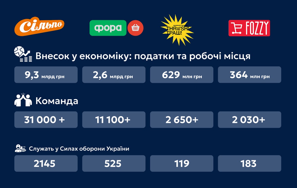 Найбільший внесок зробила мережа Сільпо — 9,3 млрд грн. Фора сплатила 2,6 млрд грн, Thrash! Траш! — 629 млн грн, а Fozzy — 364 млн грн.