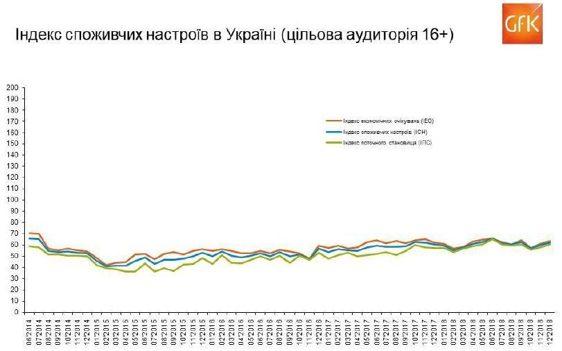 Про це свідчать дані дослідження споживчих настроїв в Україні, яке щомісяця здійснює GfK Ukraine. У грудні 2018 року індекс споживчих настроїв склав 62,2, що на 2,4 п більше, ніж у листопаді.