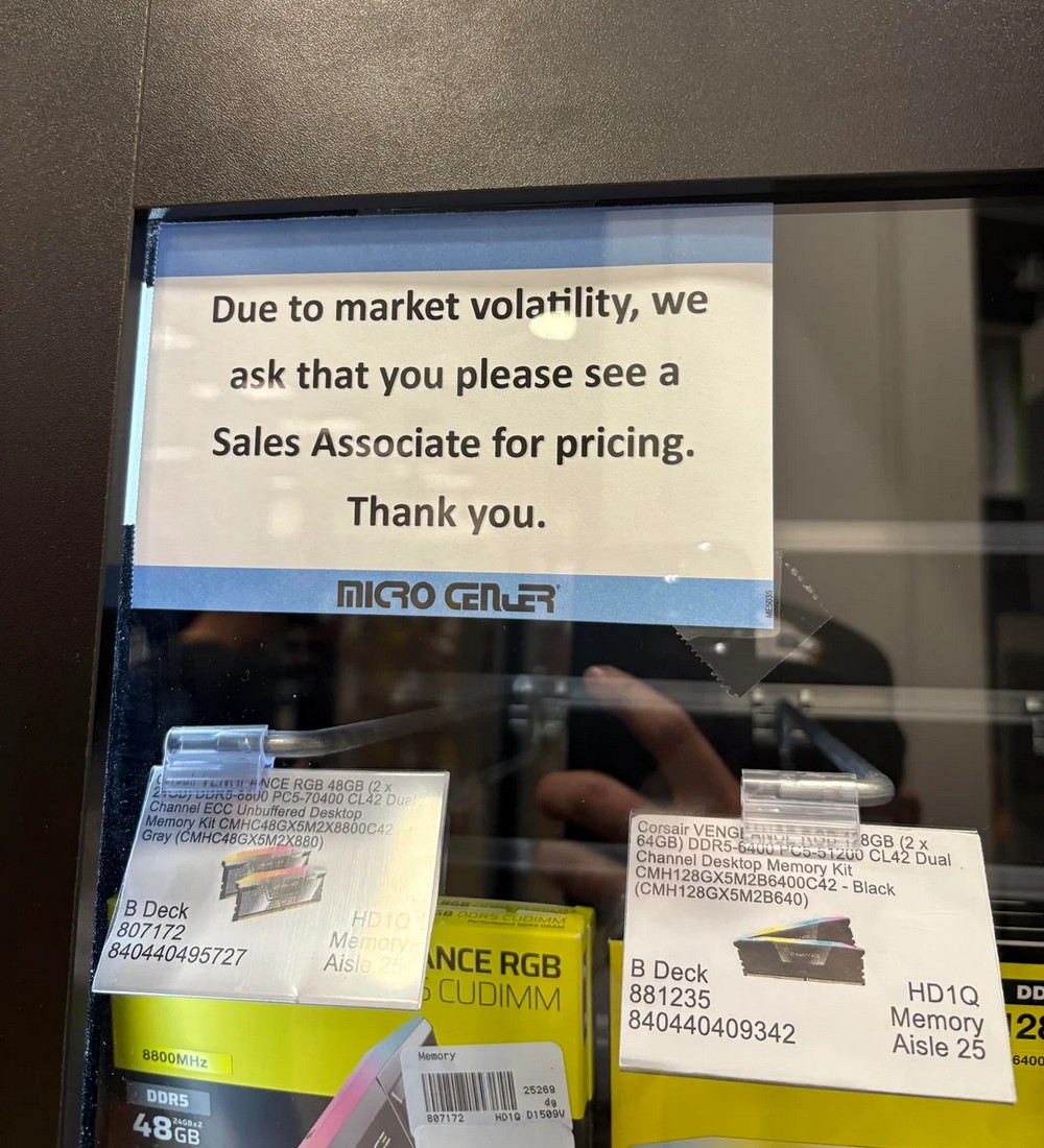 У жовтні — листопаді 2025 року американські tech-медіа заговорили про безпрецедентну цінову кризу на ринку оперативної пам’яті. Вірусними стали фото з магазинів Central Computers, де замість цінників на RAM на вітринах висіли таблички «Дізнайтеся ціну на касі» — журналісти одразу провели аналогію із ціноутворенням на делікатеси в ресторанах.