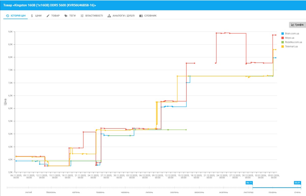 Ціни на Kingston 16 GB DDR5 5600 демонструють класичну картину цінової кризи на ринку оперативної пам’яті. У середині листопада спостерігалося короткочасне падіння до 3750 грн, після чого почалося стрімке зростання.