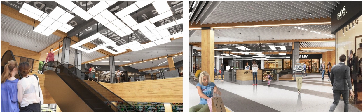Серед планованих інновацій в інтер’єрі проекту-Led Touch системи навігації та медійні екрани по ТЦ. Поверхи будуть об’єднані великим атріумом, оформленим за останніми тенденціями декору з використанням сучасних матеріалів.