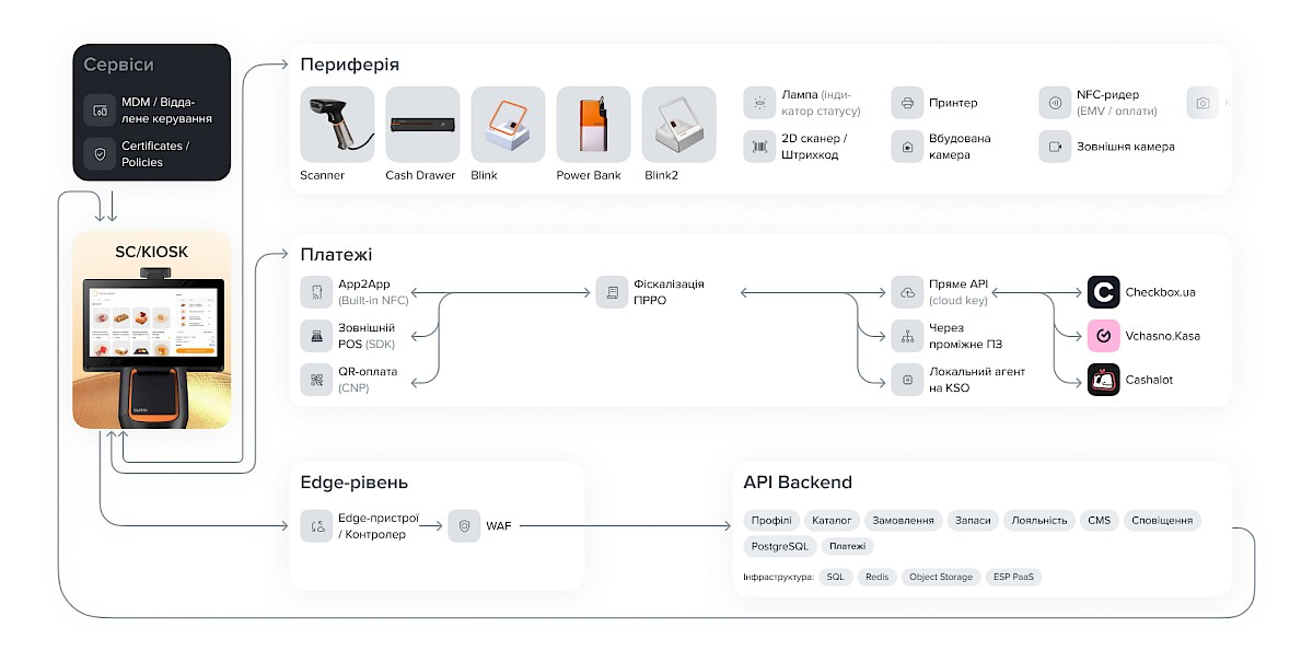 - KCO (кіоск самообслуговування) – готове рішення для self-checkout і безконтактних платежів. Швидкий запуск, просте масштабування, стабільна робота.