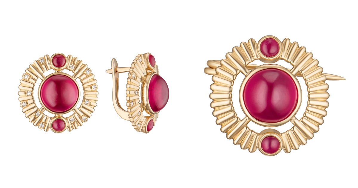 Прикраси виконані з жовтого золота з трьома варіантами вставок — рубін у формі кабошон, рубін в поєднанні з розсипом діамантів та гарнітур прикрас, оздоблений вставками з емалі кольору бургунді.
