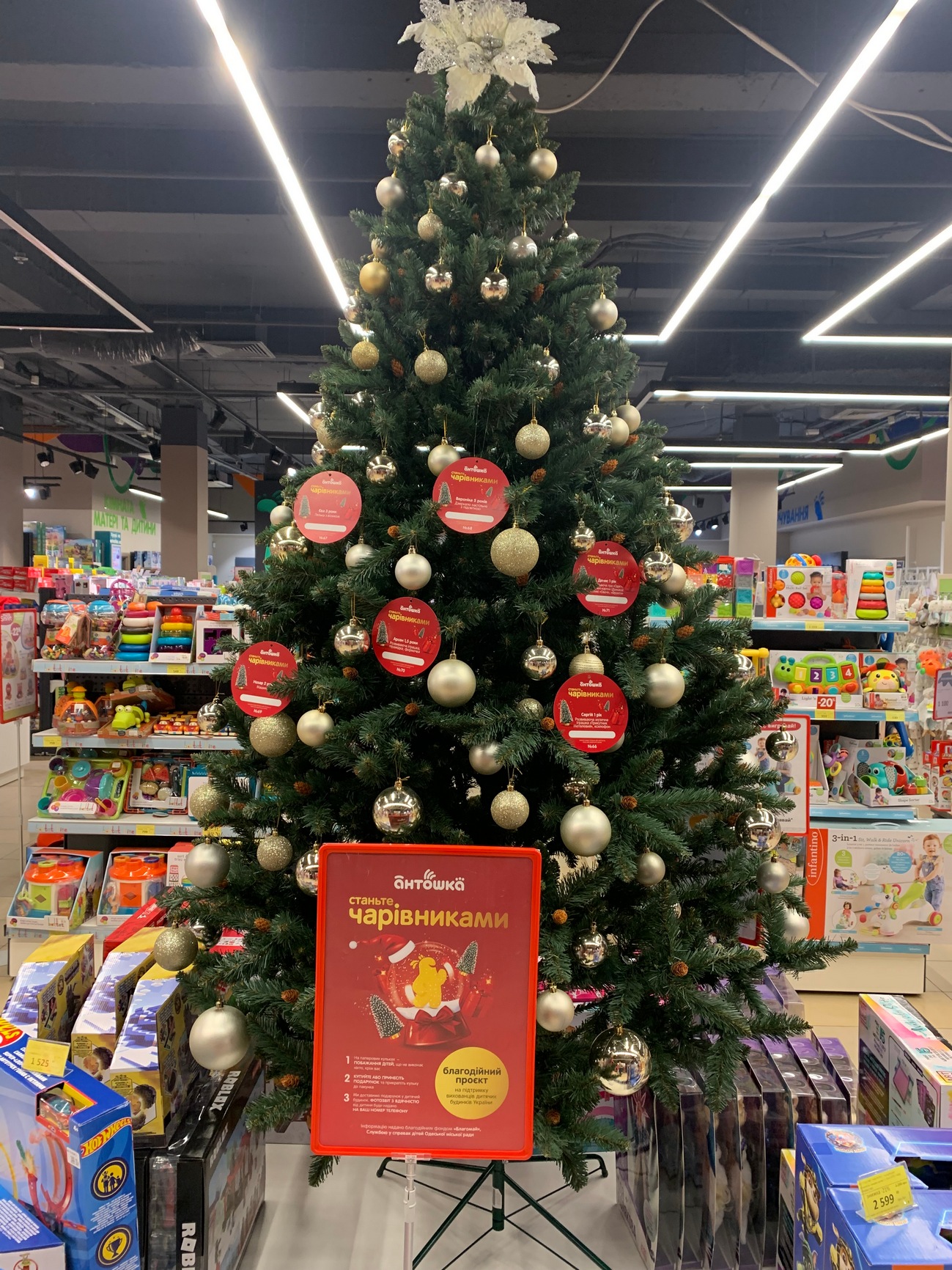 По-перше, завітати у магазин мережі Антошка, де вже стоять ялинки, прикрашені особливими паперовими кульками. Кожна з них містить побажання дітей-вихованців дитячих будинків або дітей, що мають незаможних опікунів літнього віку. Інформацію про те, що саме їм потрібно, Антошка отримує з перевірених джерел – напряму з організацій, які опікуються такими дітьми: БФ «Благомай» та Служби у справах дітей Одеської міської ради.