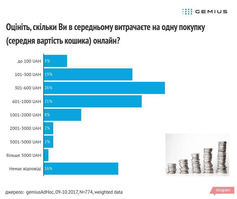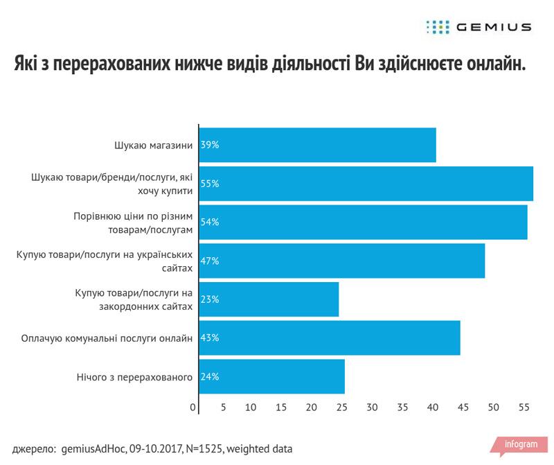 За результатами дослідження, 55% опитаних у віці від 18 до 69 років здійснюють покупки на українських або зарубіжних сайтах. З них 47% купують в Україні, 23% – за кордоном. Більше половини порівнюють ціни на різних сайтах.