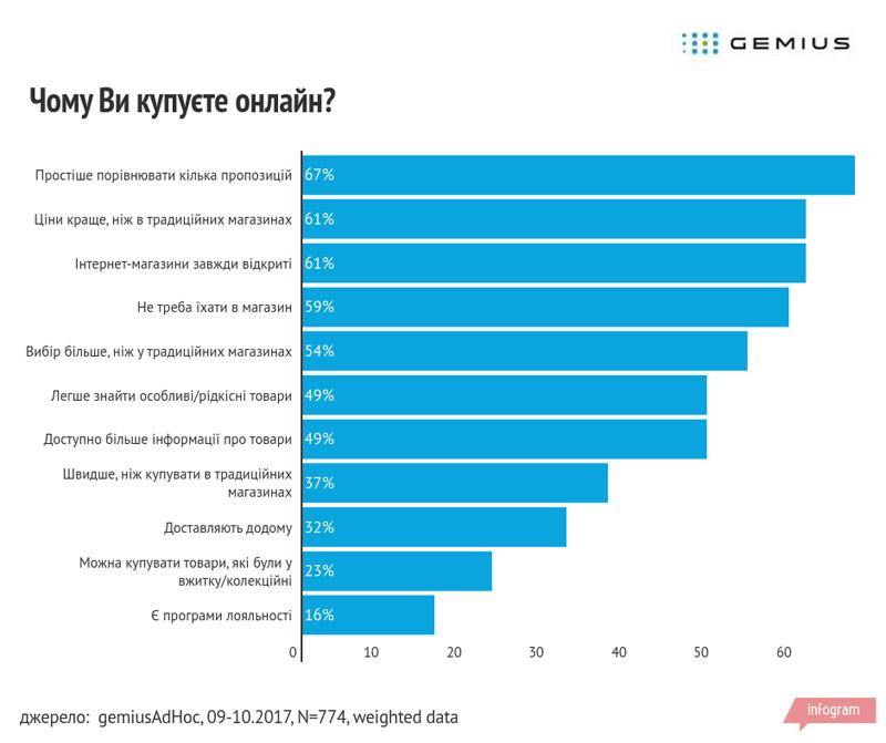Основна причина, чому купують в інтернеті – кращі ціни, зручність, простіше порівнювати пропозиції. Майже половина онлайн-покупців відзначили, що в інтернеті простіше знайти особливі або рідкісні товари, про товари простіше знайти інформацію.