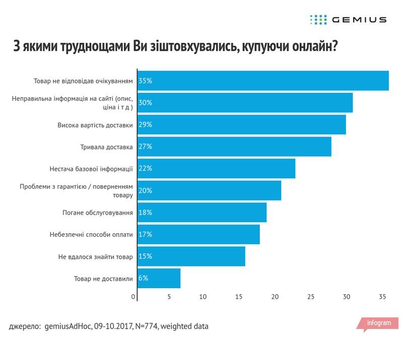 Основні проблеми, з якими покупці стикаються в онлайні – товар не відповідає очікуванням, про нього опублікована хибна інформація, у нього висока ціна доставки або ж доставка триває занадто довго. 25% стикалися з проблемами в частині повернення і гарантії.