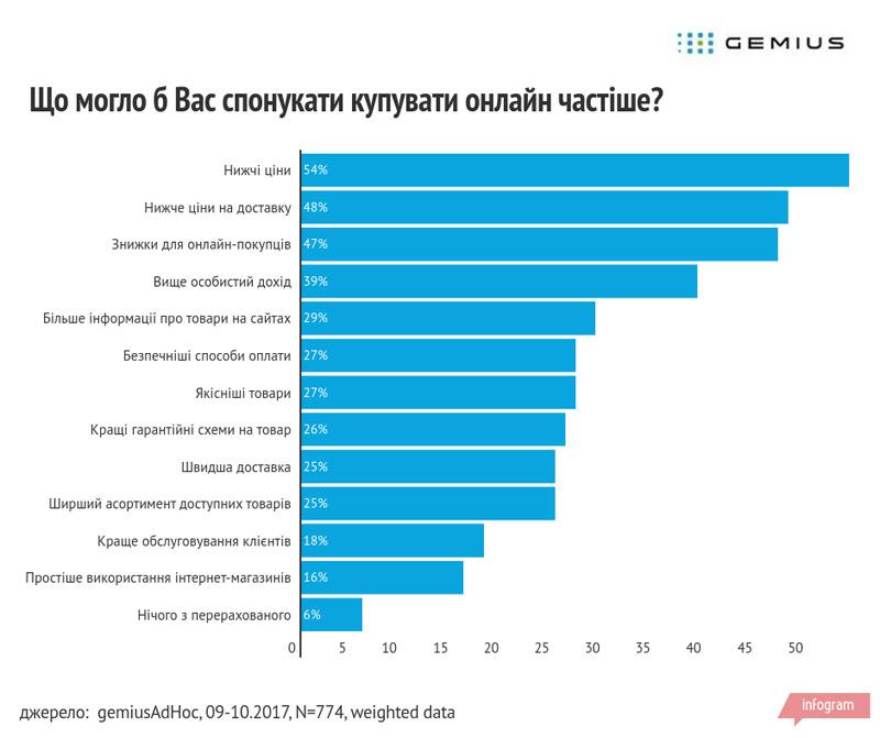 Серед чинників, які могли б мотивувати користувачів частіше купувати в інтернеті: зниження цін на товари і доставку, знижки для онлайн-покупців, швидка доставка, безпечні способи оплати.