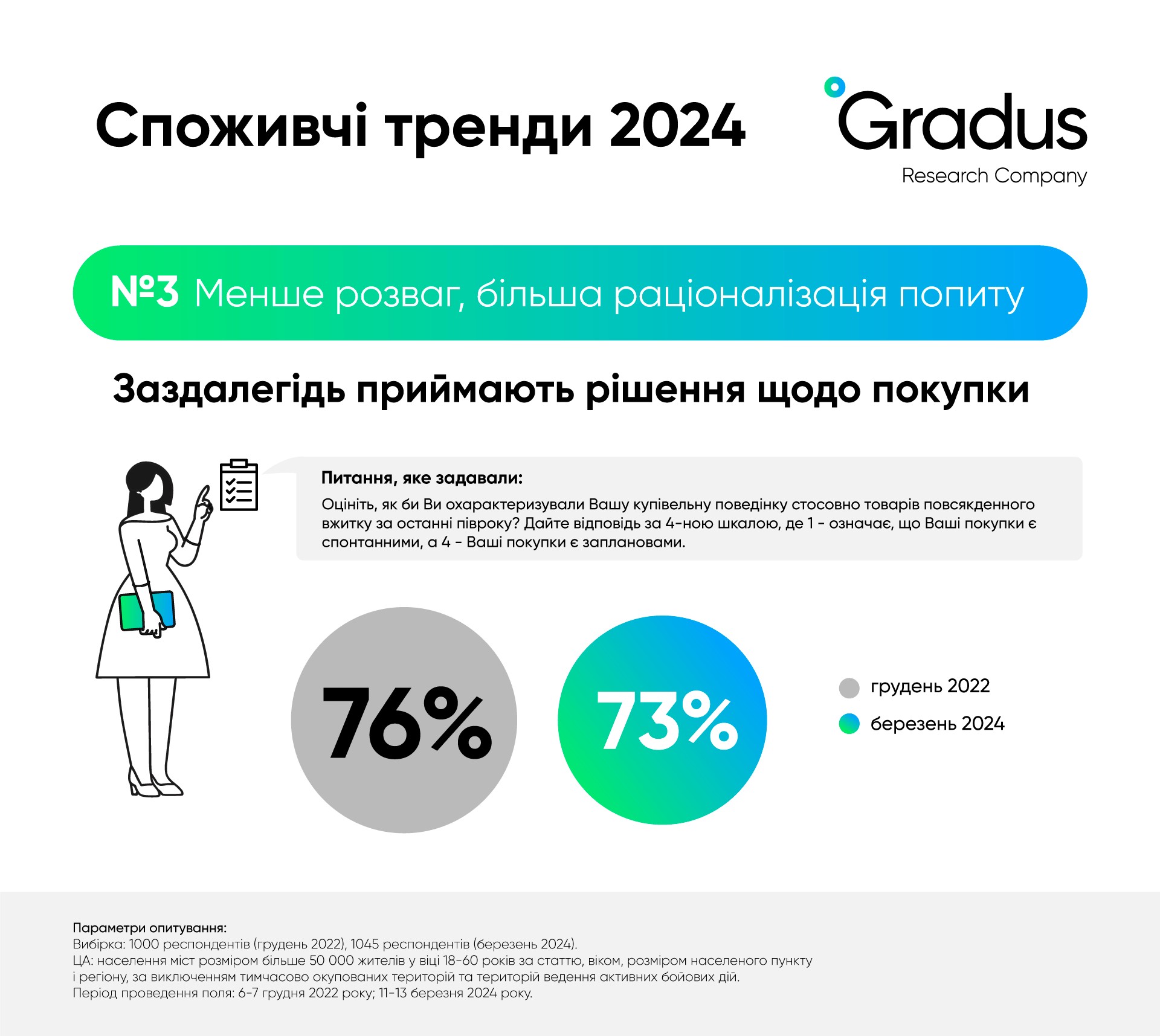 У той же час респонденти схильні скорочувати витрати на товари не першої необхідності. Детальніше про категорії, де зрізаються витрати, можна дізнатися з повного звіту дослідження. Більшість опитаних продовжують заздалегідь планувати свої покупки (73%), а не приймати спонтанні рішення.