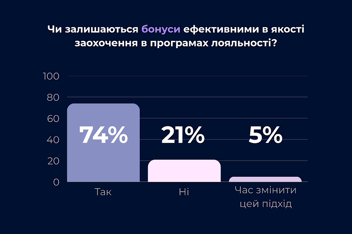 - Бонуси лояльності не втратили актуальності. Попри технологічну еволюцію, 74% респондентів вважають, що система бонусів залишається ефективною — якщо вона інтегрована у персоналізовану стратегію бренду.
