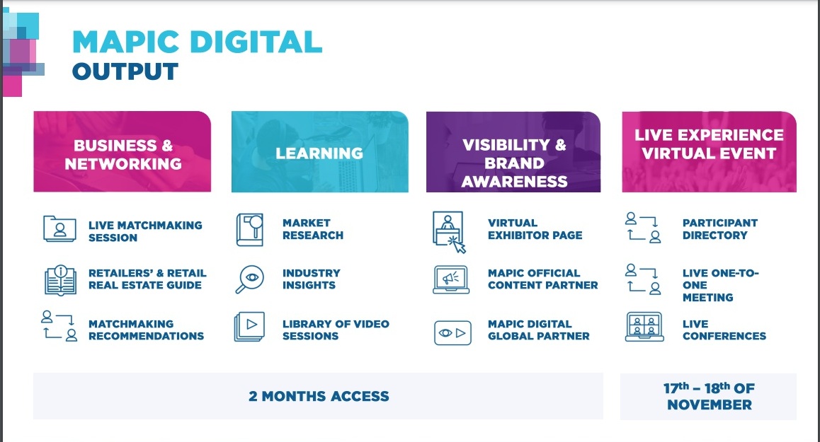 Цього року захід вперше пройде в онлайн-форматі 17 і 18 листопада – на платформі MAPIC Digital. Оскільки як ніколи раніше, індустрія розваг потребує співпраці з рітейлерами й обміні ідеями, в цьому році одночасно з MAPIC відбудеться віртуальне шоу LeisurUp – новий міжнародний захід для професіоналів сфери дозвілля. Це перша така міжнародна подія, що збере 2500 операторів і постачальників розваг, ЗМІ та власників брендів, містобудівників, представників місцевої влади та девелоперів, щоб створити унікальні, яскраві і живі враження для конкретних міст і торгових просторів.
