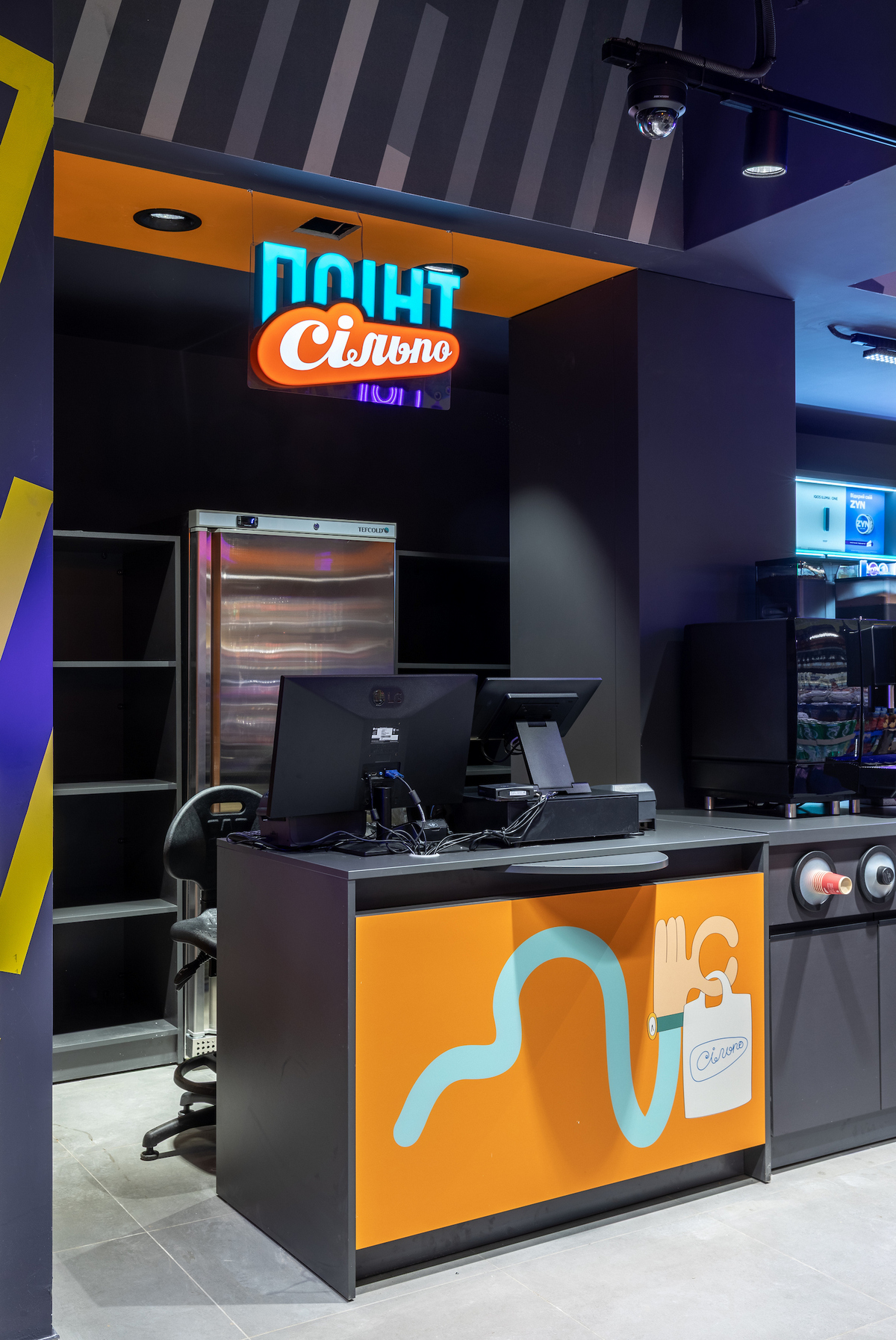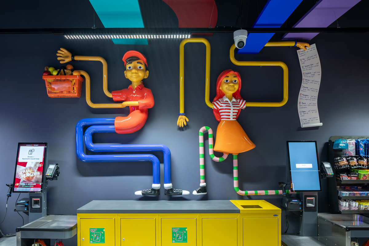 На вході гостей зустрічають веселі персонажі, які підказують напрямки, а на стелі магазину — кольорові лінії, кожна з яких веде до певного відділу. Тож навігація магазином перетворюється на маршрут з підказками, який приємно проходити разом із візочком.