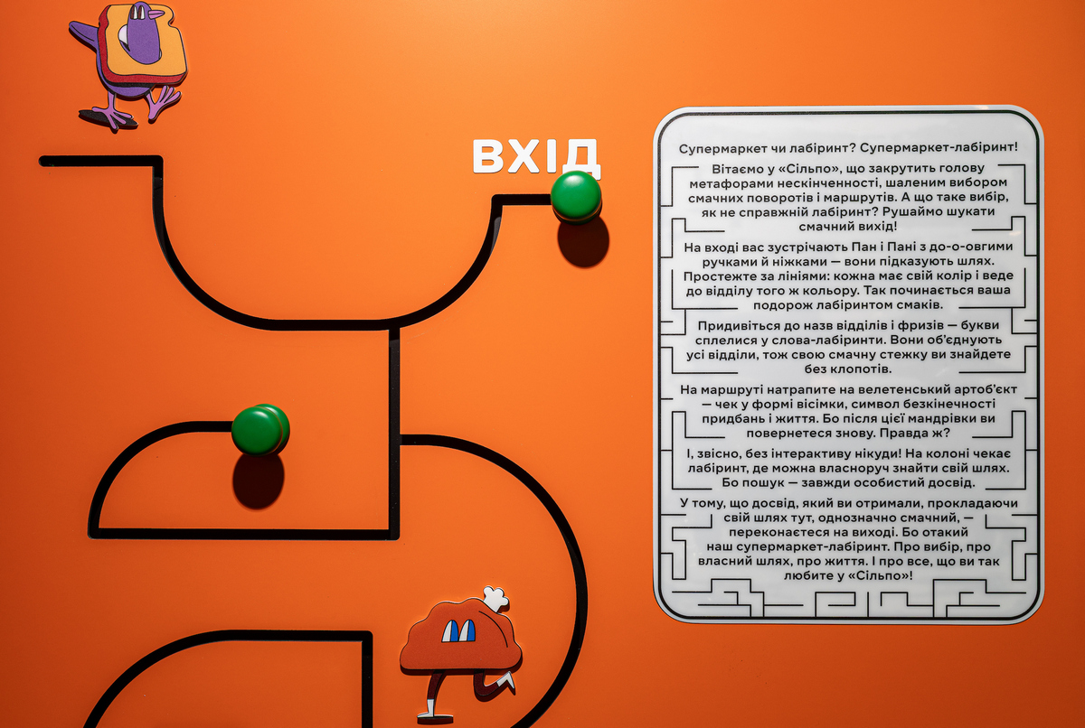 Вивіски відділів також стилізовані під лабіринти, а в центрі супермаркету розмістили головний артоб’єкт — чек Сільпо.