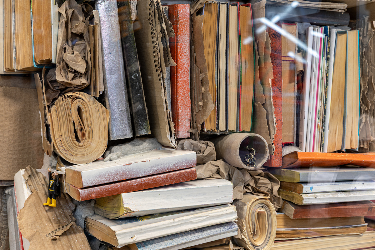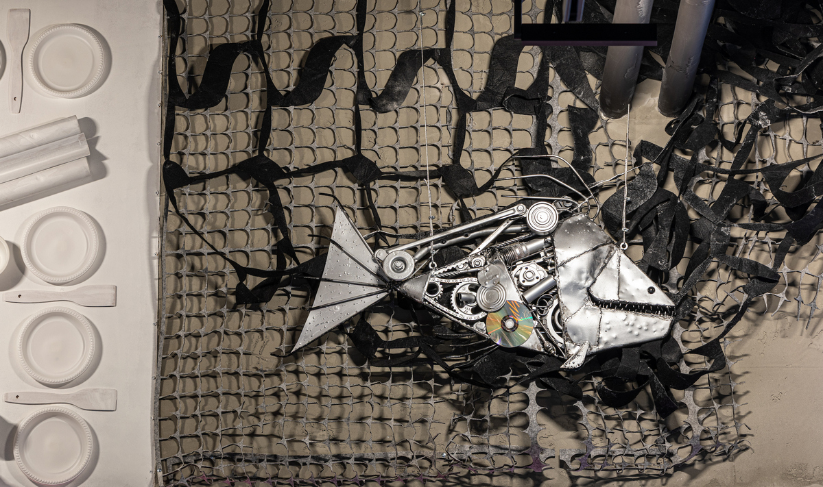 Серед інших об’єктів — велика колона з металевих візків, арт із рибами з консервних банок і дисків, арка з реальних автомобільних і мотофар. Прикасові колони оздобили непотрібною макулатурою, залишками меблевої тканини й пакетів. Касові лайтбокси також наповнили матеріалами, які могли б опинитися на сміттєзвалищі, але перетворилися в креативні куби.
