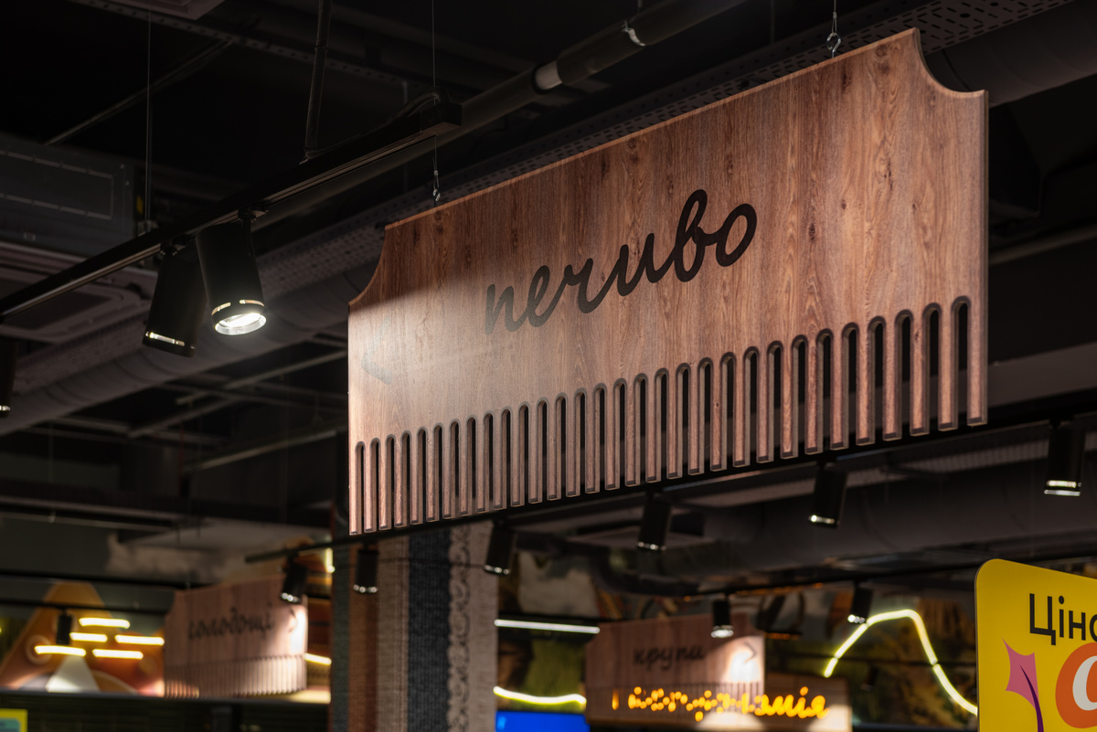 Інтер’єр поєднує теплі відтінки із використанням натуральних матеріалів та національних орнаментів. Вхідний фриз нагадує ткацький верстат з натягнутими нитками, а котушка з неоновою ниткою вплітається у назви всіх відділів магазину. Навігація в супермаркеті виконана у формі гребінців для ткацтва, а над зоною «Садовина та Городина» розмістили артоб’єкт у формі ткацького верстата, який візуально переходить у килим.