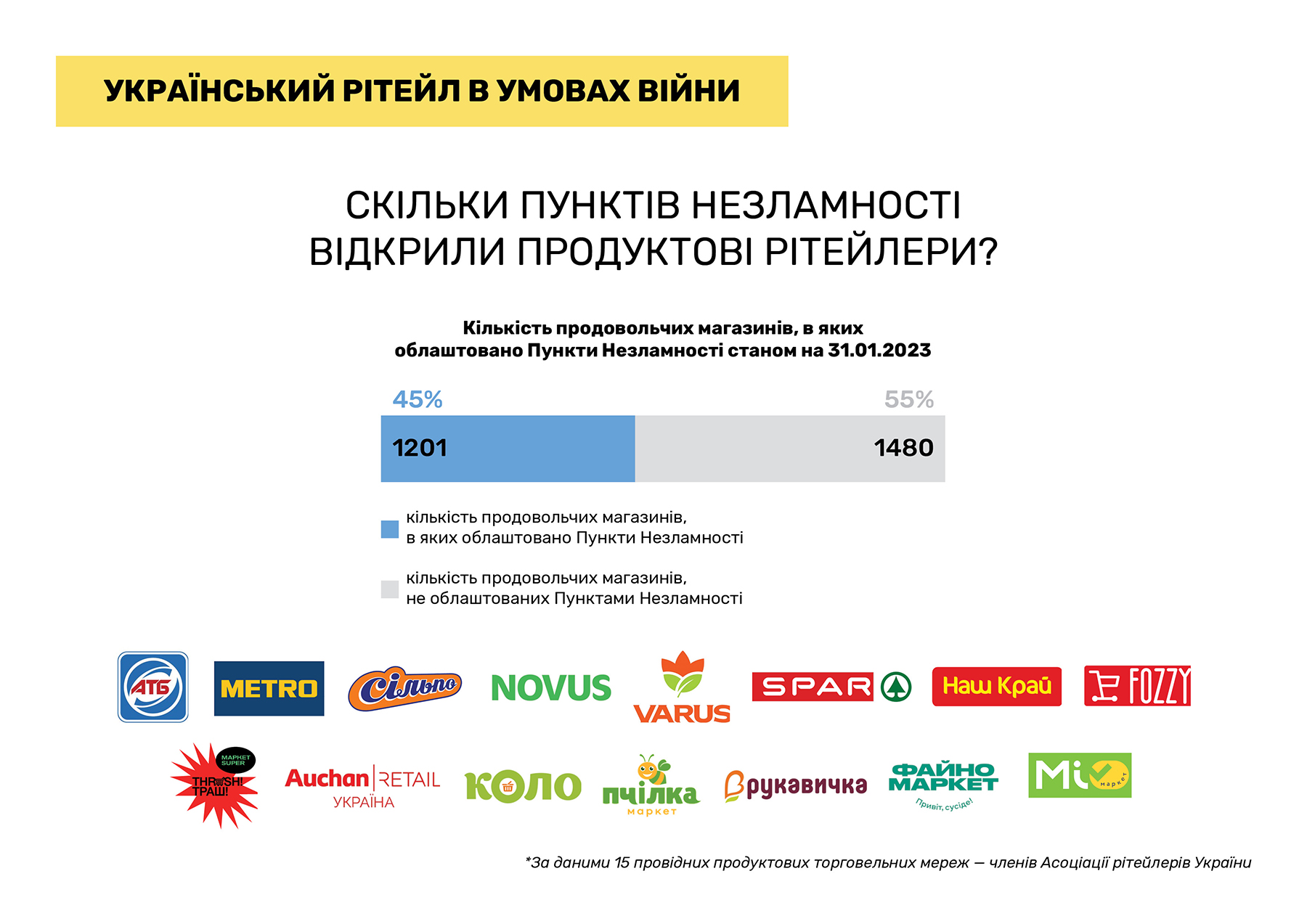 За даними дослідження Асоціації рітейлерів України, “Пункти незламності” облаштовані в 1201 продовольчих магазинах з 2681 об’єктів торгівлі, тобто в 45% магазинах, які належать компаніям, що приймали участь в опитуванні.