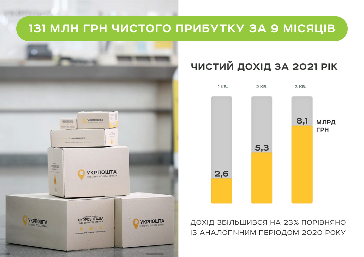За 9 місяців 2021 року Укрпошта отримала 131 млн грн чистого прибутку, що вдвічі більше, ніж за аналогічний період минулого року. Національний поштовий оператор також наростив чистий дохід на 1,6 млрд. грн, до 8,1 млрд. грн. Як повідомили RAU в компанії, Укрпошта збільшила чистий дохід на 23% порівняно з аналогічним періодом 2020 року.