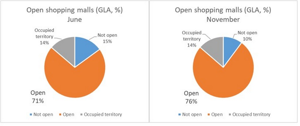 Як повідомили RAU в УРТЦ, всього на листопад відновили роботу вже 241 торгові центри орендною площею 4,4 млн кв. м з 326 всіх торгових центрів України. Це складає 76% всіх торгових площ з урахуванням ТЦ, що знаходяться на тимчасово окупованій території. Цей показник дещо виріс порівняно з початком літа, коли працювало 71% торгових площ. Не працюючими залишаються 10% торгових площ (590 000 кв. м), більша частка з яких пошкоджено. Без урахування ТЦ на окупованій території, працюють на початок листопада 88% площ в торгових центрах.