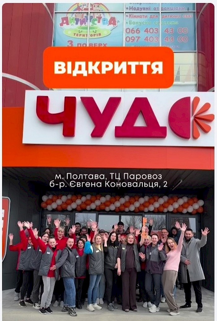 Мережа магазинів Чудо маркет, що працює в Харківській та Донецькій областях, відкрила 24 березня свій другий магазин в Полтаві за адресою: вул. Євгена Коновальця, 2 (ТЦ Паровоз). Перша точка почала роботу в обласному центрі в середині січня на вул. Чураївни, 3/2.