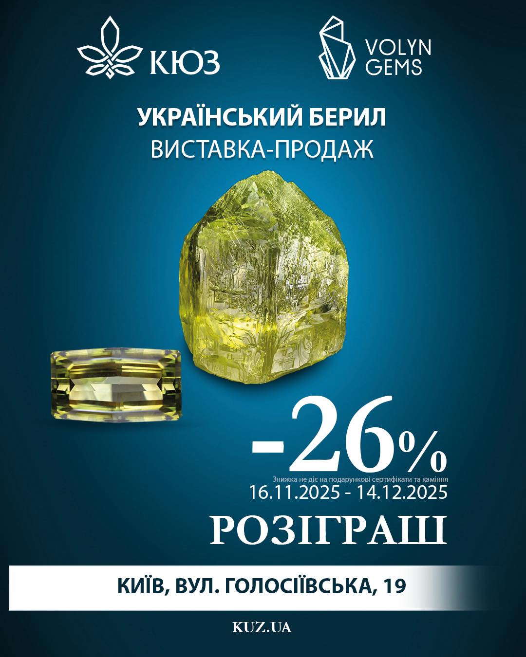 Volyn Gems - компанія що займається видобутком та огранкою дорогоцінного та напівдорогоцінного каміння Волинського родовища – разом із мережею Київський Ювелірний Завод (КЮЗ) організували виставку-продаж «Український берил» в магазині КЮЗ по вул. Голосіївська, 19. Тут можна побачити найбільший огранований Берил, що входить до Національного реєстру рекордів України, а також приватну колекцію берилів. Також відвідувачам пропонують побачити процес огранки. Водночас в магазині можна придбати прикраси з українськими берилами та саме каміння.
