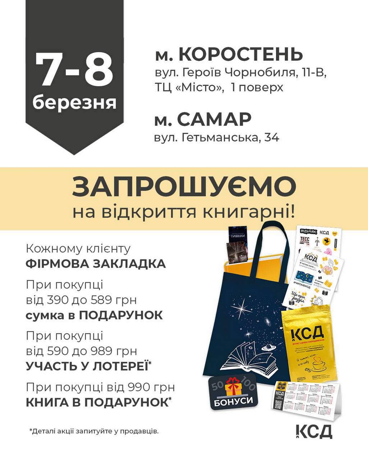 Найбільш динамічна мережа книгарень КСД (Клуб сімейного дозвілля) запустила в роботу ще три книгарні. Так, 7-8 березня відкрили свої двері крамниці в місті Коростень що на Житомирщині та місті Самар у Дніпропетровській області. Зокрема, в Коростені магазин знаходиться на першому поверсі ТЦ Місто (вул. Героїв Чорнобиля, 11 В), а у місті Самар за адресою вул. Гетманська, 34.