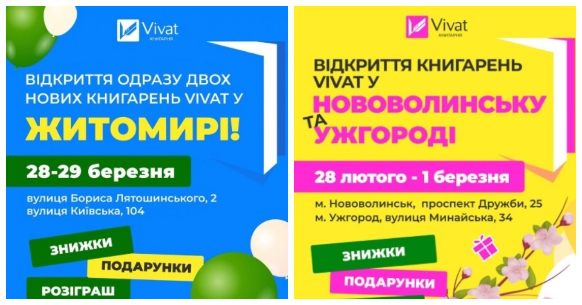 Наприкінці березня мережа книгарень Vivat повідомила про відкриття одразу двох нових торговельних точок у Житомирі. Вони знаходяться за адресами: