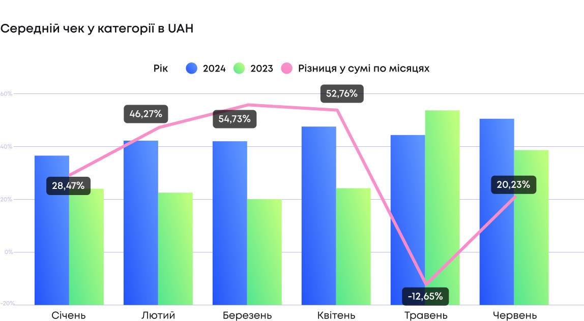 Середньозважене зростання середнього чека за півроку у доларах склало 20%. А коефіцієнт конверсії збільшився на 48%, порівняно із 2023 роком. Середній чек у ніші збільшився у гривнях на 24%, а у доларах — на 20%.